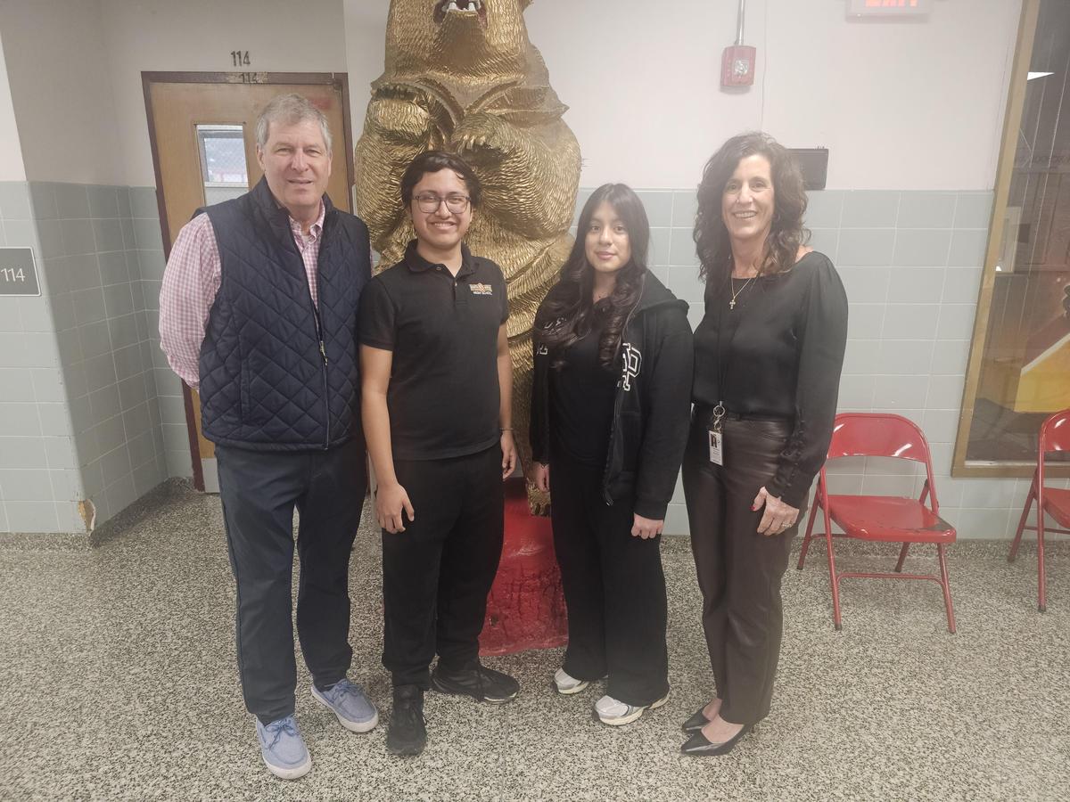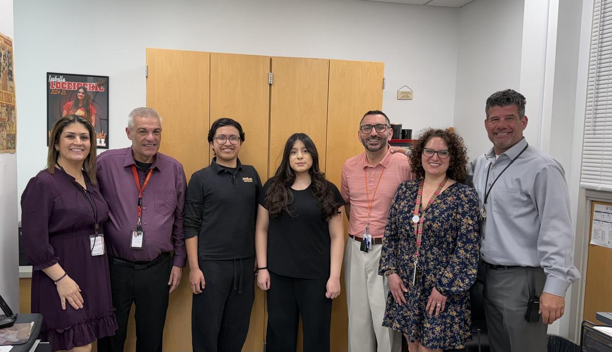 Pictured in the first photo (from left to right): Mrs. Rabelo, Mr. Locricchio, William Vega, Melanie Chauca, Jared Keshishian, Jocelyn Marto, and Mr. Tetro.